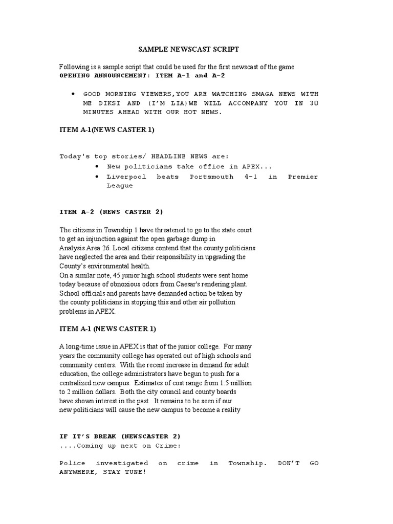 3/8/114 minutes of news plus a 1 minute commercial Here is a guide on how to write the rdr: There's been a fresh security breach at the palace of westminster, with protestors climbing onto the roof. Sports news writing example 1. Writing a news script is structural and strict in a sense that you need to cover all the facts. The viewers, upon hearing the lead, should be hooked to watch the whole report or segment. Sports journalism is an essential element of many news media organizations. Better yet, the document is verbatim, 99.9 percent accurate and letter perfect. News anchor introduction script themegolden worlds news. Decide how long your entire programme should be. Thanks eleni, i'm happy to be here filling in for george. You are listening to the six o'clock news on bbc radio four. Sports script anchor audition 1.